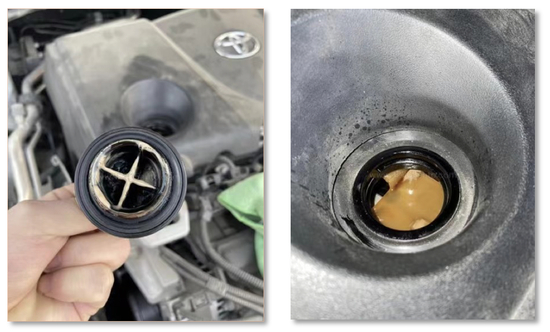 综合车主们的反馈,存在机油增多以及乳化问题的车型有三大“症状”:第一,冷车状态下机油超过机油尺上限,前述亚洲龙车主说自己的亚洲龙机油已超过机油尺上限7毫米;第二,发动机舱内机油味较为明显;第三,机油加注口的盖子有机油乳化的迹象。