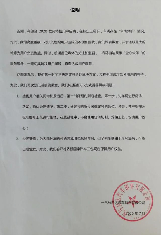 迫于舆论压力,去年7月,厂商发布了官方说明,表示将会对部分2020款阿特兹用户反映的异响问题负责到底,并将严格按照国家三包规定保障用户权益。