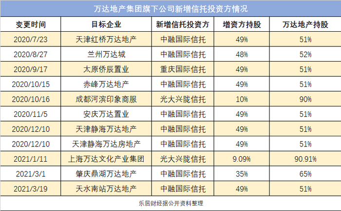 工商登记信息显示,万达地产集团目前的对外投资企业121家,当中仍在存续、在业状态的非全资子公司15家。该部分企业中,由信托机构进入持股的企业11家,占比超过73%。合作方包括中融国际信托、重庆国际信托和光大兴陇信托。
