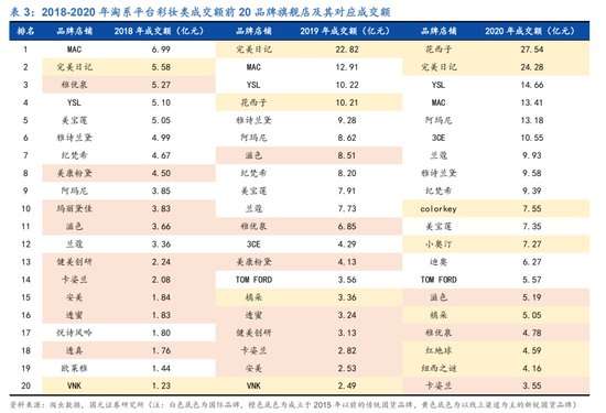 2020年天猫平台彩妆品类成交额TOP20中,花西子与完美日记力压众多国际大牌分别获得第一、第二名,此外Colorkey、小奥汀、橘朵等品牌也表现突出,均跻身前20名。