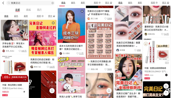 国元证券研报指出,在2018年8月之前,小红书为完美日记流量的主阵地,品牌声量占比高达45.91%。完美日记在小红书上做了不少投放,大多以美妆KOL对于口红、眼影等产品的试色笔记形式呈现,借助这一方法,品牌初步打开了知名度。