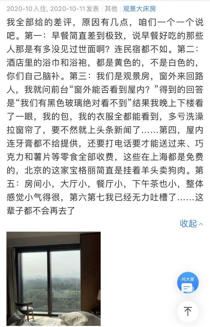 此外,界面记者留意到,亦有不少网友在携程上投诉深坑酒店,投诉问题主要集中在卫生差、餐食差、酒店房间冷等问题上。对于此次测评提出入住问题,深坑酒店相关工作人员表示事情还在调查中,稍后会做出回应。