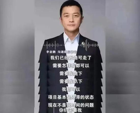 随后网上流传一段录音,录音中李亚鹏表示“我们已经无路可走了,需要怎样我都可以,需要我跪下,需要我趴下都可以。”而据泰和友联方面证实,这段录音其实来源于2015年,是李亚鹏发在泰和友联投资有限公司几位关联方的微信群里的语音。