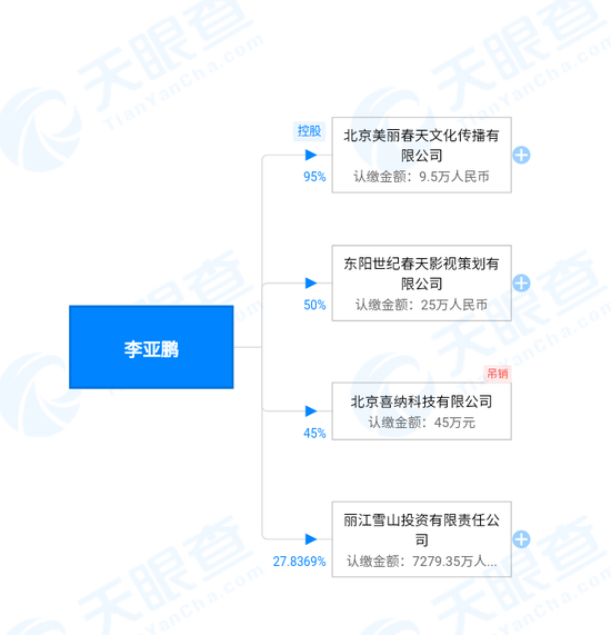 据天眼查显示,李亚鹏担任股东的公司有四家,除了“欠债4000万元”纠纷中涉及的丽江雪山投资有限责任公司,还有东阳世纪春天影视策划有限公司、北京美丽春天文化传播有限公司。而北京喜纳科技有限公司则处于吊销状态。
