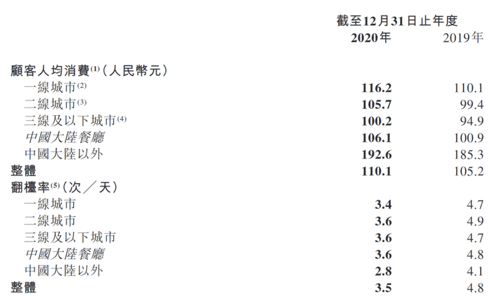 海底捞门店2020年翻台率3.5次/天,其中2020年下半年的平均翻台率已回升至2019年同期的75%以上。不过,顾客人均消费价格却从105.2元涨到了110.1元。2020年全年,海底捞餐厅服务超过2.5亿人次顾客,海底捞会员超过7100万人。