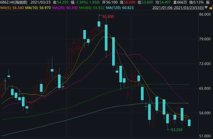 2020年,海底捞一路上涨,到今年2月16日曾达到85.8元的高点,市值也达到4547亿元。但之后海底捞股价便一路走低,截至3月23日已经跌到了54.25港元,总市值较最高点时蒸发1672亿港元,为2875亿港元。