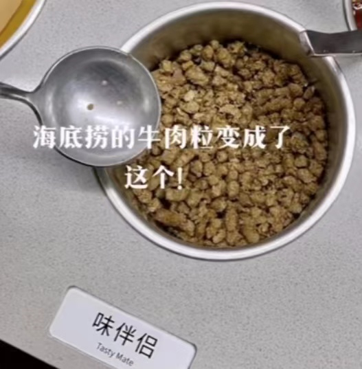 值得注意的是,近日,海底捞将其自助小料里的牛肉粒换成与其外观相似的“味伴侣”,引起了网友的热议。