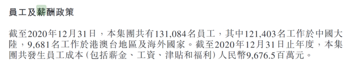 业绩公告显示,截至2020年12月31日,海底捞共有131084名员工,共发生员工成本(包括薪金、工资、津贴和福利)96.76亿元。
