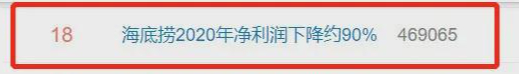 此前,早在3月1日,海底捞就已给投资者打过“预防针”,预告称2020年净利润同比下降约90%。其给出的解释是因新冠疫情防控措施对消费场所实施的限制对集团营运造成重大影响。这一消息还曾登上微博热搜。
