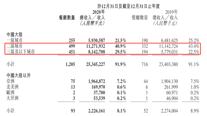 三线以下城市451家餐厅,总收入81.43亿元,平均一家餐厅贡献营收约1805万元。