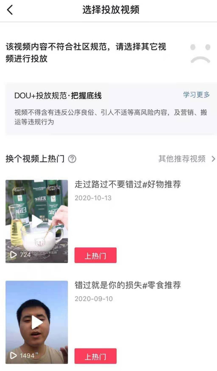 然而没过多久,张磊就失望地发现“一切都是套路”。“我连续半个月每天上传视频,但上传的15条视频大多数都被抖音判定为‘搬运’而没有成功发布。”张磊提供的截图显示,他在抖音上投放视频失败的原因包括视频内容不符合社区规范、视频内容可能涉及非原创、无创作的素材引用等。