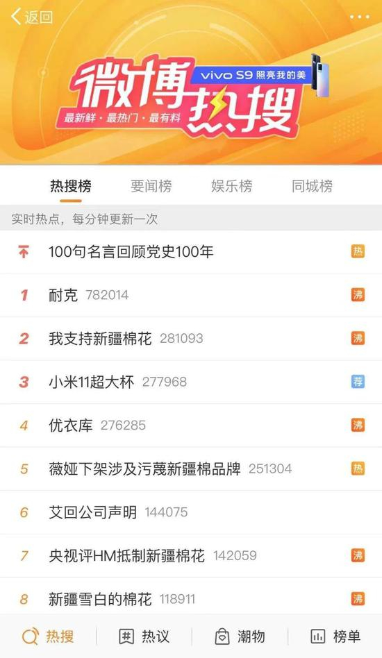 目前,H&M事件在网上仍在发酵,自事情发生以来,H&M相关话题持续占据微博等社交平台热搜榜单,耐克、优衣库等品牌也因网友指出抵制新疆棉花被冲上微博热搜。