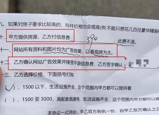 问题就出在这个信息费上,众多网友展示出来的合同上可以看到,所谓信息费规定的是乙方出钱,甲方提供房源信息。杭州知名律所钱律师向锌财经解释,信息费不等于佣金,中介只需要提供房源信息,交易就算完成。至于消费者是否成功租到房子,并不是合约内的内容。