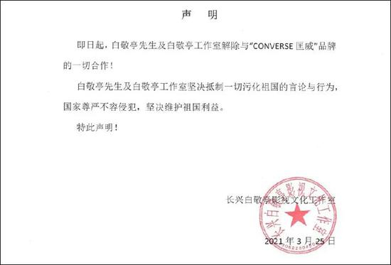 欧阳娜娜、白敬亭工作室也发布声明, 表示终止与匡威品牌的一切合作。