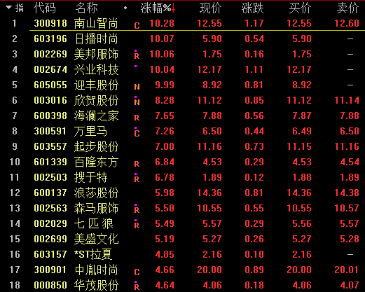 3月25日早盘,A股市场服装纺织板块走强,南山智尚、日播时尚、美邦服饰涨幅均超10%,浪莎、海澜之家、太平鸟、七匹狼、拉夏贝尔也纷纷大涨。