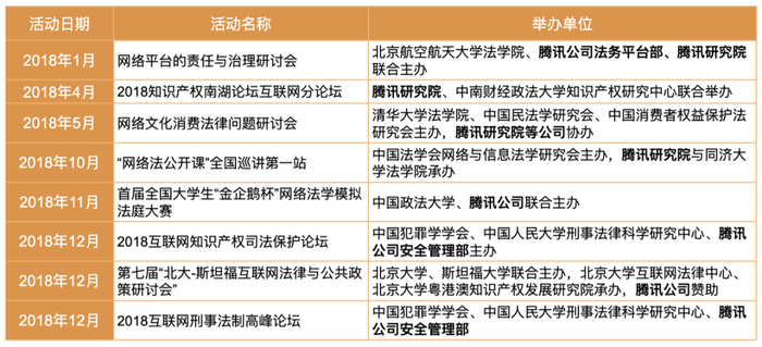 如从2012年开始,腾讯连续七年赞助了“北大-斯坦福互联网法律与公共政策研讨会”,直到现在,仍与中南财经政法大学知识产权研究中心每年联合举办“知识产权南湖论坛”。