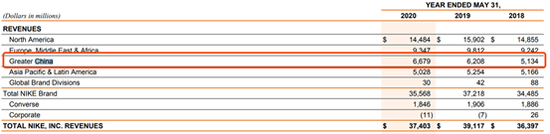 实际上,从2018-2020财年的数据可以看到,在耐克布局的全球市场中,大中华区是唯一一个保持正增长的地区,在耐克营收中的占比从14%提升至18%左右。
