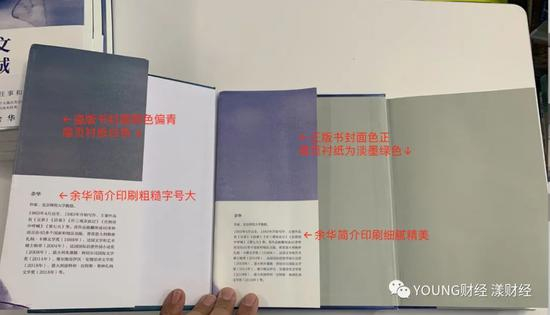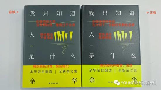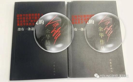 图17:余华作品,左为盗版:封面用纸劣质,覆膜过于光滑,无纸张颗粒感;黄色图案和腰封部分颜色过深,暗沉。右为正版:封面使用特种纸,在光下和触摸时有明显的颗粒感和涩感。图案部分和腰封部分颜色为柠檬黄,色彩清透。盗版书购自拼多多爱嘉书店