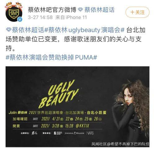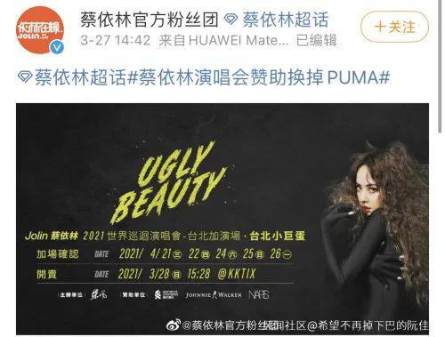 同时,蔡依林2021世界巡回演唱会在中国台北的加演场即将于4月开唱,原宣传海报中的赞助单位里标有PUMA。