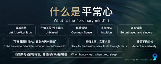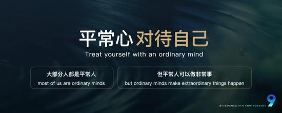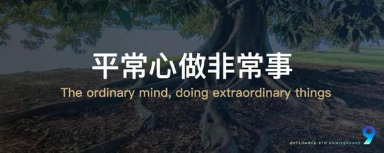 3月30日,在公司9周年庆上,字节跳动创始人张一鸣发表了演讲《平常心做非常事》,分享了他对于“平常心”的思考:如何以平常心对待自身、公司业务、行业竞争、成功和失败。