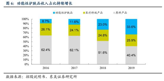 2019年,公司三大业务板块原料、功能性护肤品、医疗终端营收占比分别为40.4%、33.6%、25.9%,其中原料业务占比较2016年下降约22个百分点,而功能性护肤品占比大幅上升,从2016年的8.7%涨到了2019年的33.6%,成为公司第二大业务。