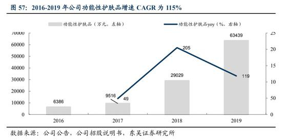 2016-2019年,华熙生物功能性护肤品业务的复合年均增长率达到115%,相当于年年翻倍。2016年公司功能性护肤品业务实现营收0.64亿元,2019年已达到6.34亿元,同比增长118.5%,增速领涨各业务。