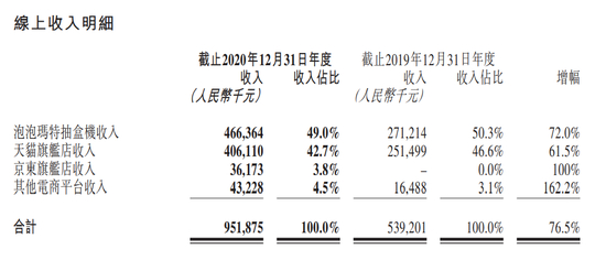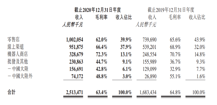 从贡献营收的具体渠道来看,2019年度线上渠道的收入5.39亿,2020年实现了9.52亿收入,营收增速为76.5%,表现出色。与零售店收入39.9%的占比相较,线上渠道的收入将近与线下零售店持平。