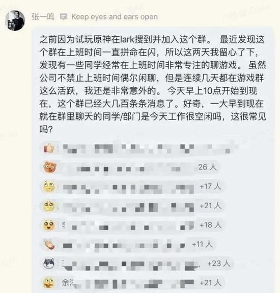但很快,他就对这个问题有了一次更直接的体验。在为了了解游戏业务而试玩原神时,张一鸣在字节跳动内部的飞书群中搜到了相关的游戏群,在“悄悄加入”后,却发现“一些同学经常在上班时间非常专注的聊游戏”。