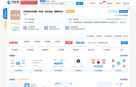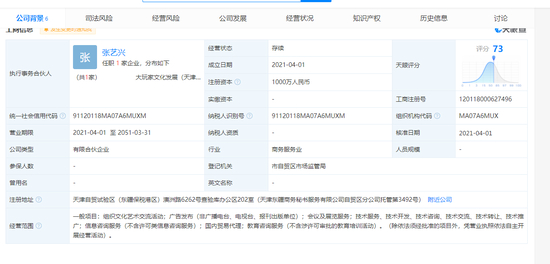 天眼查App显示,4月1日,大玩家文化发展(天津)合伙企业(有限合伙)成立,注册资本1000万人民币,法定代表人为张艺兴,经营范围含组织文化艺术交流活动;广告发布;信息咨询服务;国内贸易代理;教育咨询服务等。股东信息显示,该公司由张艺兴、黄磊、黄渤等共同持股,持股比例分别为45%、20%、10%。