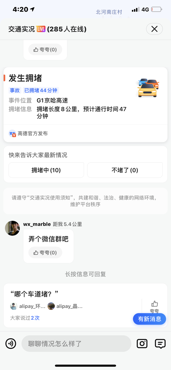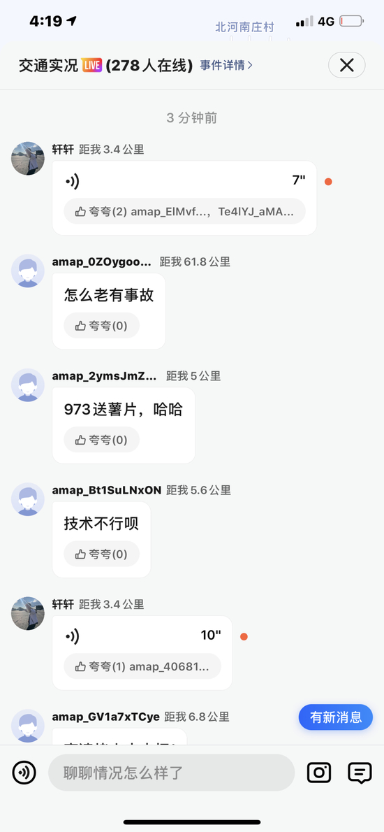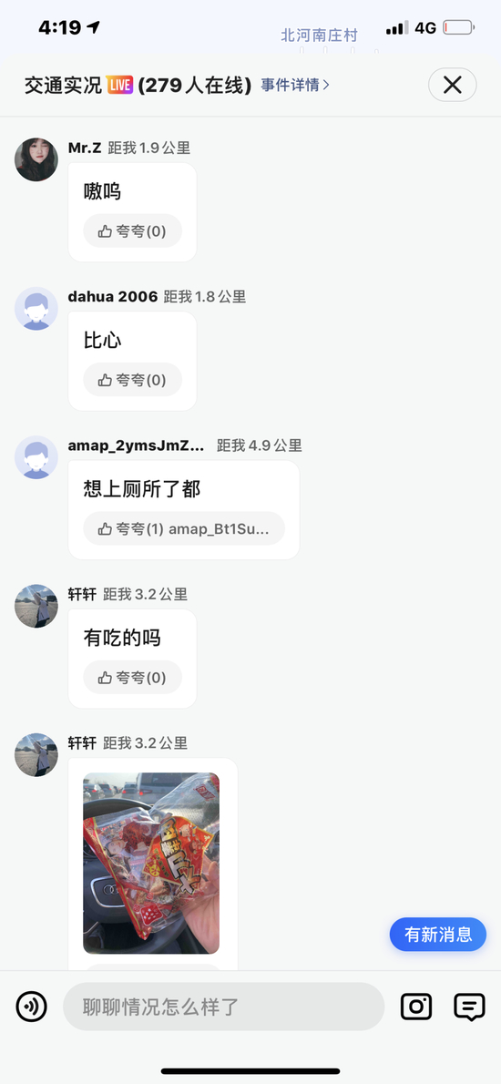 “哎,你看,高德还能聊天?”驾驶座上的家属把手机递过来,是一个群聊界面,显示277人在线聊天,有人发图,有人发语音。每个用户昵称后面,都标注着距离我的公里数,对话框内,每条信息下方都有个(夸夸)的提示,类似点赞。