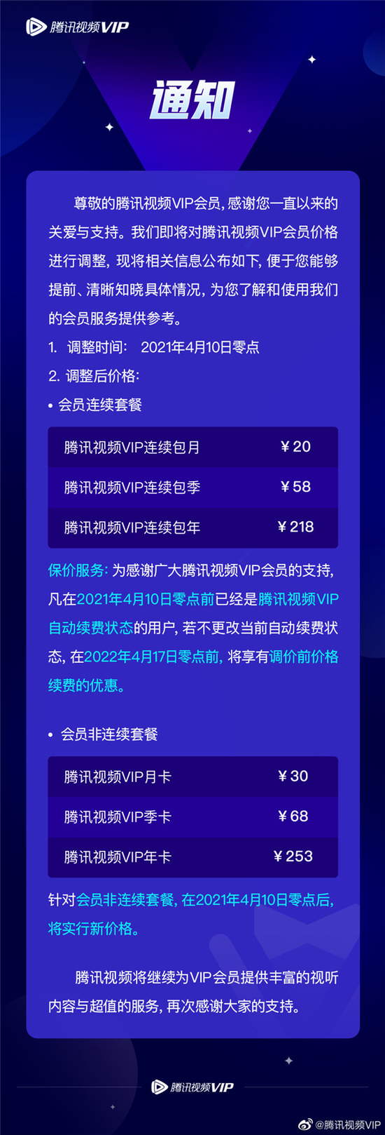 很显然,爱奇艺、腾讯视频这两大视频巨头只记住了这句话的后半句。继去年11月爱奇艺涨价之后,腾讯视频也于近日官宣将于4月10日零点对腾讯视频VIP会员价格进行调整: