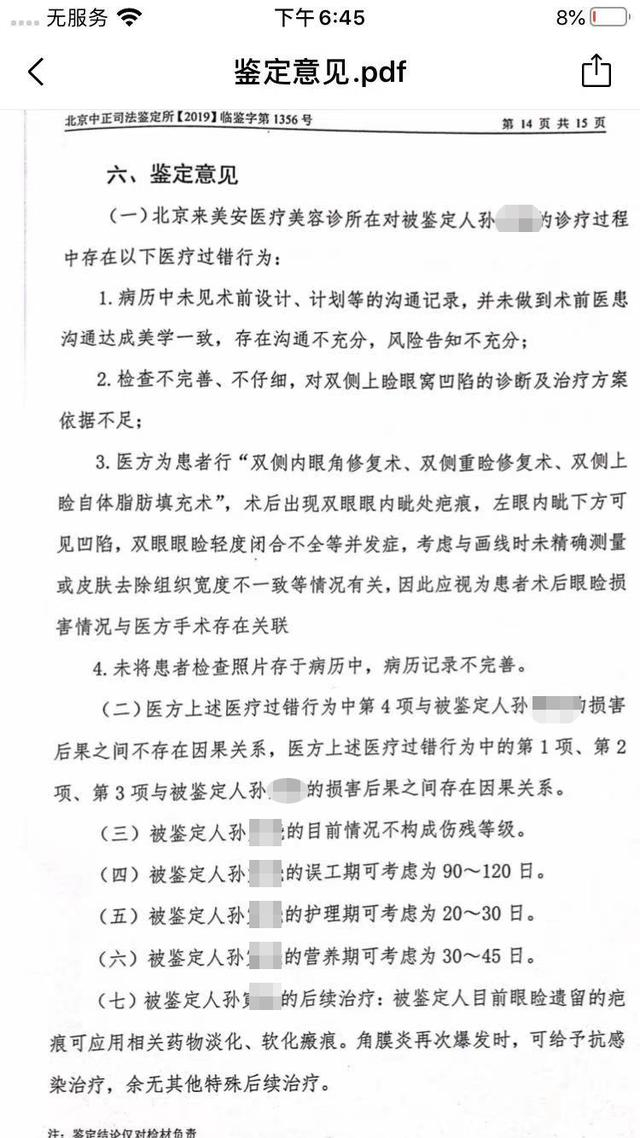 北京中正司法鉴定所2019年8月作出的鉴定意见书显示,来美安在孙萌的诊疗过程中存在多项医疗过错行为:1、病例中未见术前设计、计划等的沟通记录,未做到术前医患沟通达成美学一致,存在沟通不充分、风险告知不充分;2、检查不完善、不仔细,对双侧上睑眼窝凹陷的诊断及治疗方案依据不足;3、医方为患者行“双侧内眼角修复术、双侧重睑修复术、双侧上睑自体脂肪填充术”,术后出现双眼眼内眦处疤痕,左眼内眦下方可见凹陷,双眼眼睑轻度闭合不全等并发症,考虑与画线时未精确测量或皮肤去除组织宽度不一致等情况有关,因此应视为患者术后眼睑损害情况与医方手术存在关联;4、未将患者检查照片存于病历中,病历记录不完善。