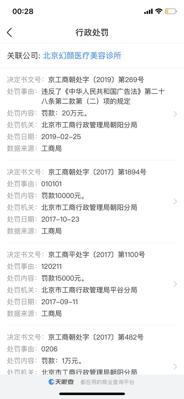 2019年,来美安更名为北京幻颜医疗美容诊所,其因虚假宣传、违法广告曾多次被行政处罚。(截图)