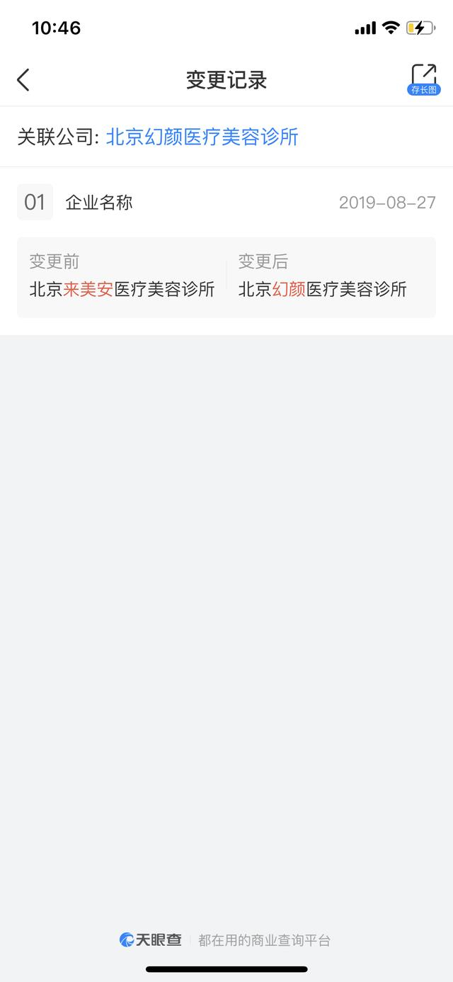 澎湃新闻查询发现,2019年8月,来美安更名为北京幻颜医疗美容诊所。目前仍在运营的“北京睐美安医疗美容诊所”微信公众号显示,“来美安”中的“来”被改为“睐”,其中称2019年8月来美安品牌全新升级,对其品牌名称、地址、环境、技术理念等全面升级。在其简介中,来美安称其眼整形修复品牌有十年的历史,而在之前的广告中,其称有30年的技术历史。