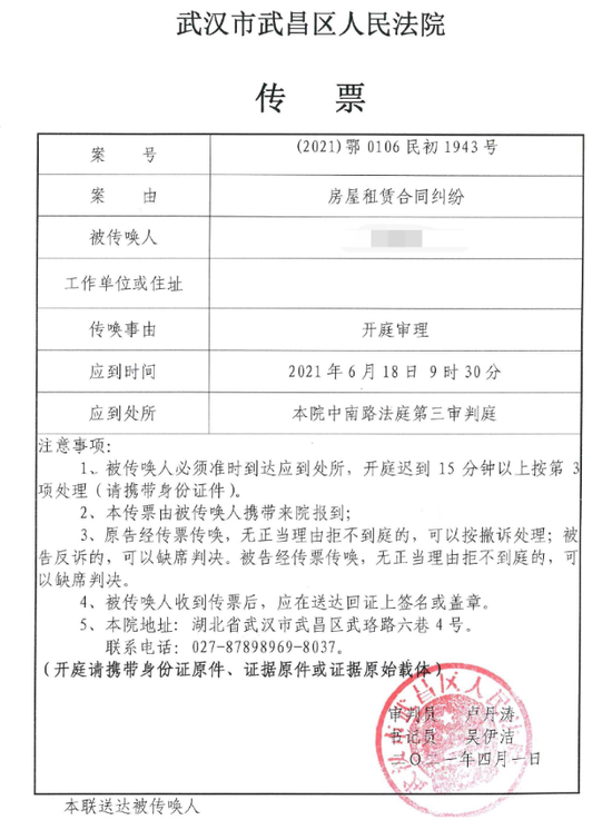 不过也有个别幸运儿已经等到了法院传票。一位来自武汉的租客在微博晒出了一张图片,表示立案第38天时终于收到了来自武汉市武昌区人民法院的传票,涉及金额1万余元,拟于6月18日开庭。