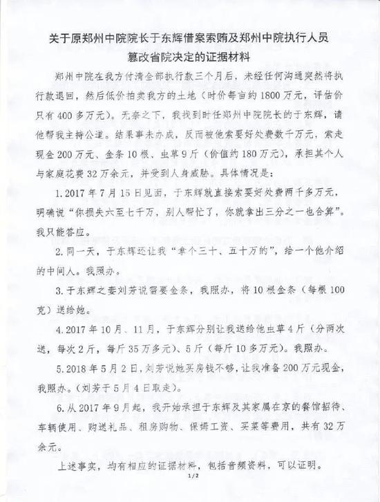 昨日,一段实名举报视频引发网络热议。视频中,一名自称是“河南省隆庆祥服饰有限公司总裁姜书敏”的女子,举着自己的身份证,“实名举报郑州中院原院长于东辉索贿500万元财物”。据其表示,于曾索要“六七千万的三分之一”,实际索得现金200万元、金条20根、虫草9斤,总价值约为500万元。