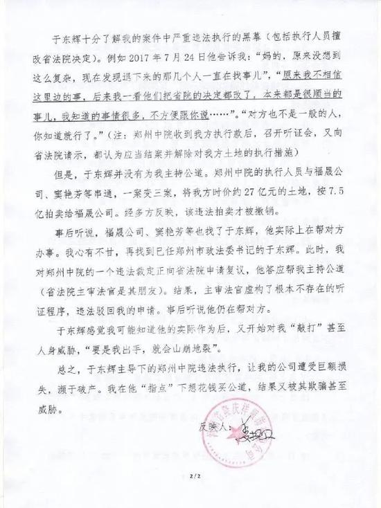 据公开资料显示,被举报者于东辉曾任河南省高级人民法院民事审判第二庭庭长,洛阳市中级人民法院党组书记、院长。2014年2月至2018年11月,他就任郑州市中级人民法院党组书记、院长。