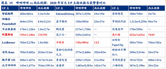 根据华创证券发布的报告,尽管西瓜视频重金挖人,B站对于UP主仍具有不可替代性。这主要表现在两平台不同的“粉丝数/获赞量”的比值上。以2020年百大UP主为例,这些人在B站的平均粉丝数/点赞量为356万/1860万,而西瓜为155万/92万。无论是粉丝基数,还是获赞程度,B站的社区活跃度都具有不可替代性。