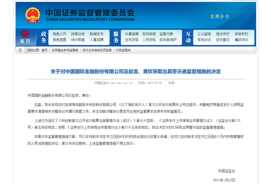 具体来看,中金公司因未勤勉尽责督促发行人按照监管要求清理相关对赌协议并履行披露义务,未主动就对赌协议是否符合相关监管要求发表专项核查意见等,违反相关规定。证监会决定对中金公司及赵言、黄钦采取出具警示函的监督管理措施。