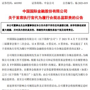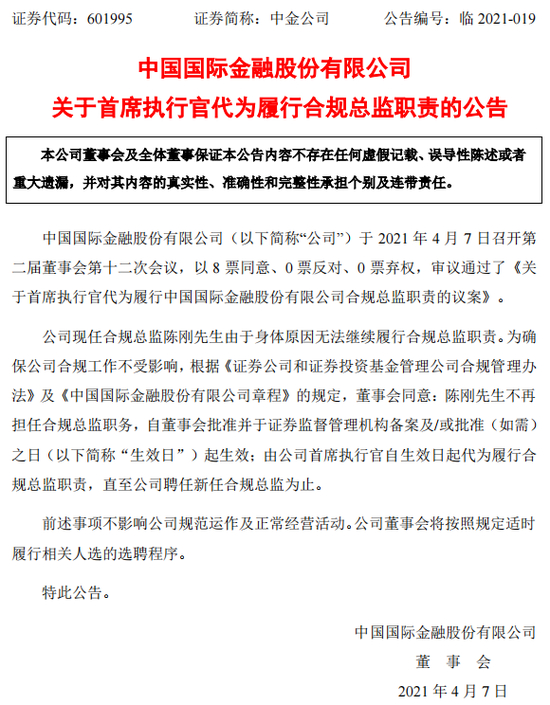 4月7日晚,中金公司发布关于首席执行官代为履行合规总监职责的公告。公告内容指出,公司现任合规总监陈刚由于身体原因无法继续履行合规总监职责。