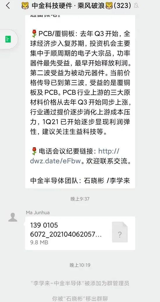 4月7日,有一份9分钟的电话录音,被丢进了中金公司半导体团队的一个300多人的客户群。录音内容是中金公司一名马姓员工的老公打电话与陈律师沟通,经过交涉和逼问后,陈律师承认了与马姓员工出轨。
