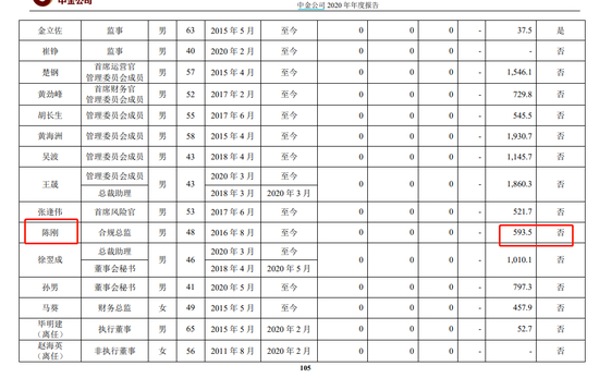 公司资料显示,2019年和2020年,陈刚在中金的年薪分别为596.7万、593.5万。