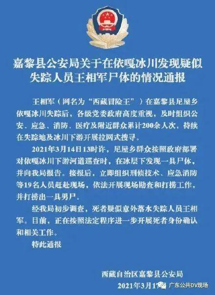 2月22日,西藏那曲嘉黎警方就“西藏冒险王王相军失踪成谜”一事发布警情通报。其中提到,王相军系意外落水失踪。
