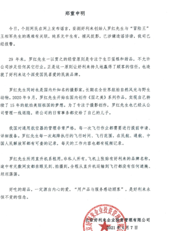 7日晚,好利来官方微博发布声明,对相关言论作出回应称,个别网民在网上发布谣言,妄测好利来创始人与“冒险王”王相军遇难有关联,纯属无中生有,捕风捉影,已涉嫌造谣诽谤,好利来公司已报警。