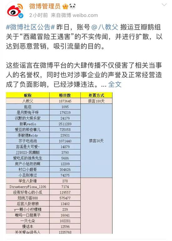 现根据《微博社区公约》等有关社区规则对账号@八教父 禁言180天的处罚。此外,对转发相关谣言内容的37个账号给予禁言30天或禁言15天的处罚。