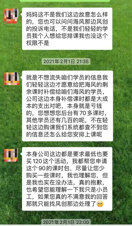 根据3月底张琳向《国际金融报》记者展示聊天记录截图,上述轻轻海风班主任曾在2月初通知她,因为张琳当初是与海风教育签订的合同,轻轻教育是在各方协调之下进行行业互助,接受海风委托维护付费用户,现委托期已到,海风的剩余课时将于一天后全部停掉,“现在还剩79.5个课时没有上,课程进度完成还不到50%”。