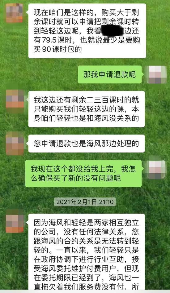 该客服表示,目前行业互助已经结束了,学员在海风教育购买的课程,无法继续在轻轻教育使用。3月底,张琳向记者提供的一张与轻轻教育老师的聊天记录显示,只有购买大于海风教育剩余课时的轻轻课程,才能继续海风教育的课程。
