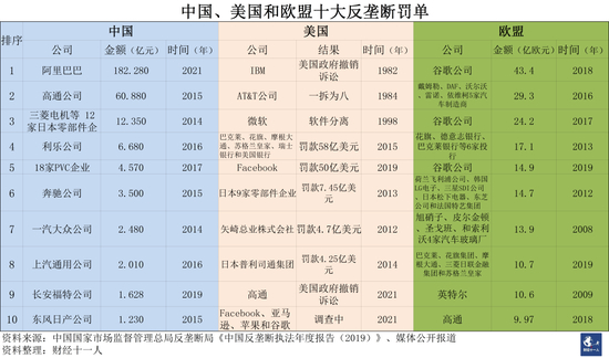但是相较欧美“同行”,182亿元(约27.79亿美元)就逊色很多。2017年-2019年,欧盟反垄断委员会向谷歌开出82.5亿欧元(约98亿美元)罚单,2019年,美国联邦贸易委员会向脸书开出50亿美元罚单。