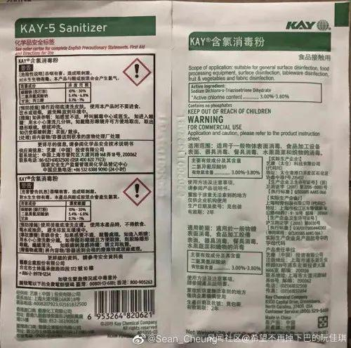 在医生要求下,这家肯德基的店长把配制消毒水的“含氯消毒粉”外包装发了过来。