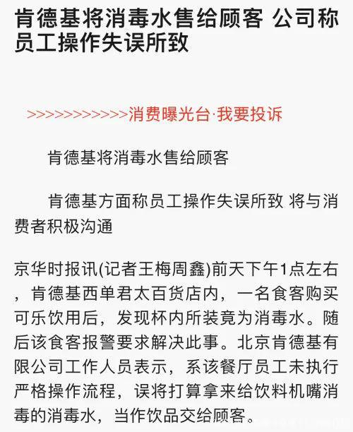 有网友发现多年来,曾有多人在网络吐槽肯德基不同门店都发生过多起将消毒水误当饮料提供给食客的事情。